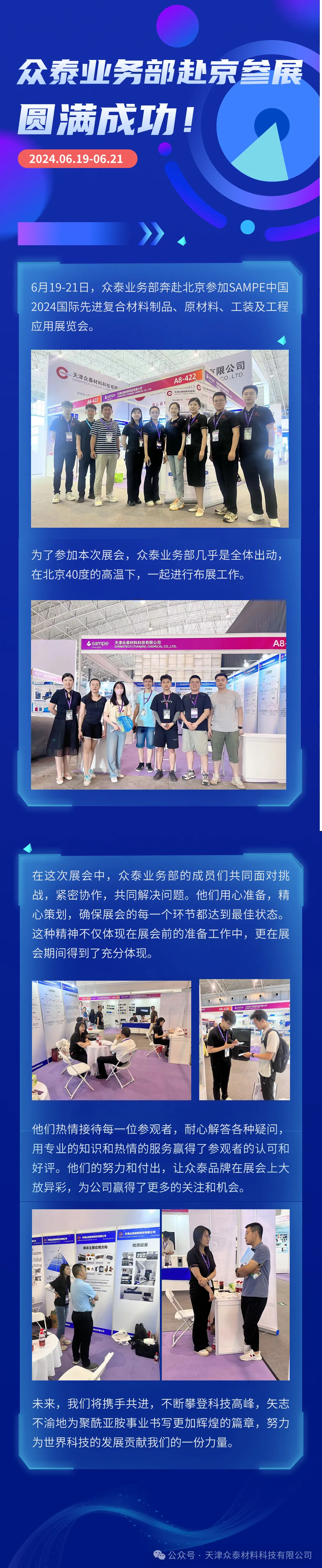 6月19日-21日,眾泰業(yè)務(wù)部奔赴北京參加SAMPE中國(guó)2024國(guó)際先進(jìn)復(fù)合材料制品、原材料、工裝及工程應(yīng)用展覽會(huì)。在這次展會(huì)中,眾泰業(yè)務(wù)部的成員們共同面對(duì)挑戰(zhàn),緊密協(xié)作,共同解決問題。